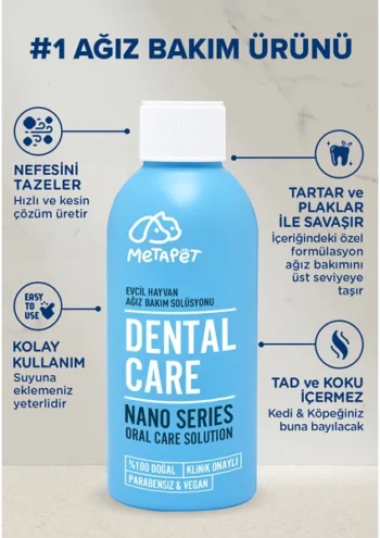 Evcil dostunuzun ağız kokusu, plak ve tartar gibi sorunları gidermeye yardımcı olan Metapet Nano Series Ağız Bakım Suyu, diş ve diş etlerinde tam koruma sağlar.; İlk kullanımdan itibaren ağız kokusuna neden olan etkenleri ortadan kaldırır.; Metapet’in yenilikçi teknolojisi ile formüle edilen bu ağız bakım suyu, diş sağlığını korurken aynı zamanda tartar oluşumunu ve diş sararmasını önler.; Bu teknoloji sayesinde evcil hayvanınızın ağız sağlığı en üst düzeye çıkar.; Kullanım Talimatı: 500 ml içme suyuna ölçek yardımıyla 10 ml ekleyerek günlük olarak kullanılması tavsiye edilir; Ağız kokusuna neden olan tüm etkenleri hızlı bir şekilde ortadan kaldırır, güvenli ve etkili içeriği ile öne çıkar.; Metapet Nano Series Ağız Bakım Suyu ile patili dostlarınızın ağız sağlığını koruyun ve onların mutlu, sağlıklı bir yaşam sürmelerine katkı sağlayın.; Artık ağız bakımı kolay ve etkili bir şekilde gerçekleştirilir.