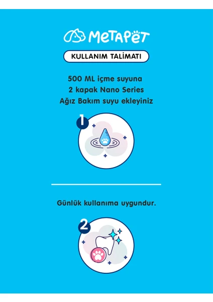 Evcil dostunuzun ağız kokusu, plak ve tartar gibi sorunları gidermeye yardımcı olan Metapet Nano Series Ağız Bakım Suyu, diş ve diş etlerinde tam koruma sağlar.; İlk kullanımdan itibaren ağız kokusuna neden olan etkenleri ortadan kaldırır.; Metapet’in yenilikçi teknolojisi ile formüle edilen bu ağız bakım suyu, diş sağlığını korurken aynı zamanda tartar oluşumunu ve diş sararmasını önler.; Bu teknoloji sayesinde evcil hayvanınızın ağız sağlığı en üst düzeye çıkar.; Kullanım Talimatı: 500 ml içme suyuna ölçek yardımıyla 10 ml ekleyerek günlük olarak kullanılması tavsiye edilir; Ağız kokusuna neden olan tüm etkenleri hızlı bir şekilde ortadan kaldırır, güvenli ve etkili içeriği ile öne çıkar.; Metapet Nano Series Ağız Bakım Suyu ile patili dostlarınızın ağız sağlığını koruyun ve onların mutlu, sağlıklı bir yaşam sürmelerine katkı sağlayın.; Artık ağız bakımı kolay ve etkili bir şekilde gerçekleştirilir.